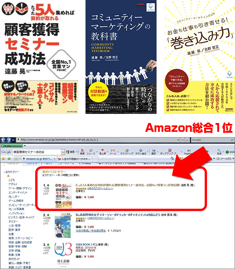 著書には、ダイヤモンド社から「たった5人集めれば契約が取れる顧客獲得セミナー成功法」がある。Amazonで総合1位を獲得。当時の2位は「もしドラ」、3位は「村上春樹さん」。その他にも、「コミュニティーマーケティングの教科書」「お金も仕事も引き寄せる!巻き込み力」を出版。